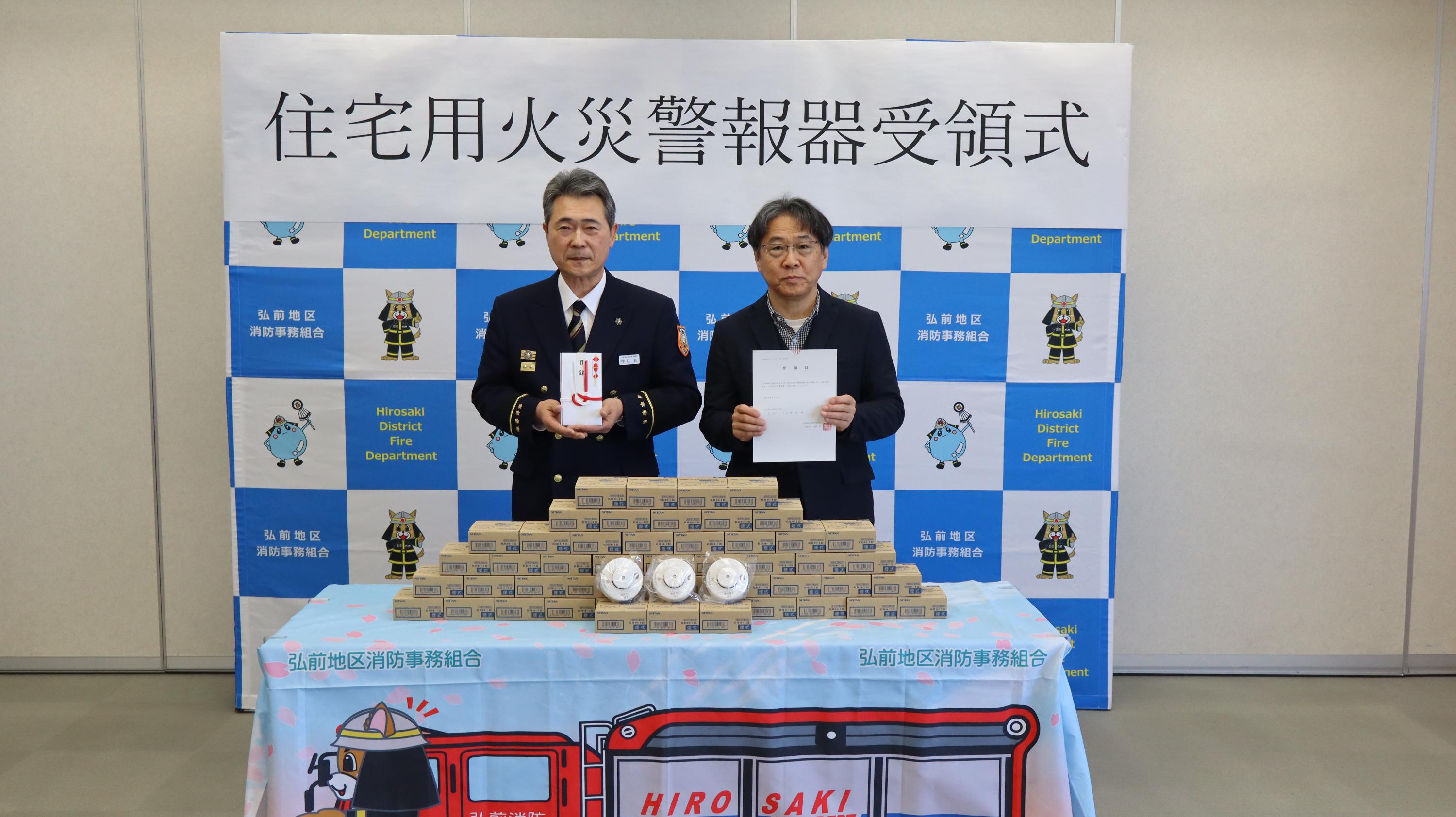 | 2026/2/13 | 住宅用火災警報器寄贈 令和8年2月13日弘前地区消防事務組合消防本部3階大会議室にて、当協会会長より住宅用火災警報器50個が弘前地区消防事務組合に寄贈されました。 当協会では、令和元年から住宅用火災警報器寄贈事業を継続して行っており、火災予防の一助とすることを目的に実施しております。今後とも当協会と弘前地区消防事務組合が協力し住宅防火対策の推進に努めるとともに、災害に強い安全で安心して暮らせるまちづくりに取り組んでまいります。 ![]() |